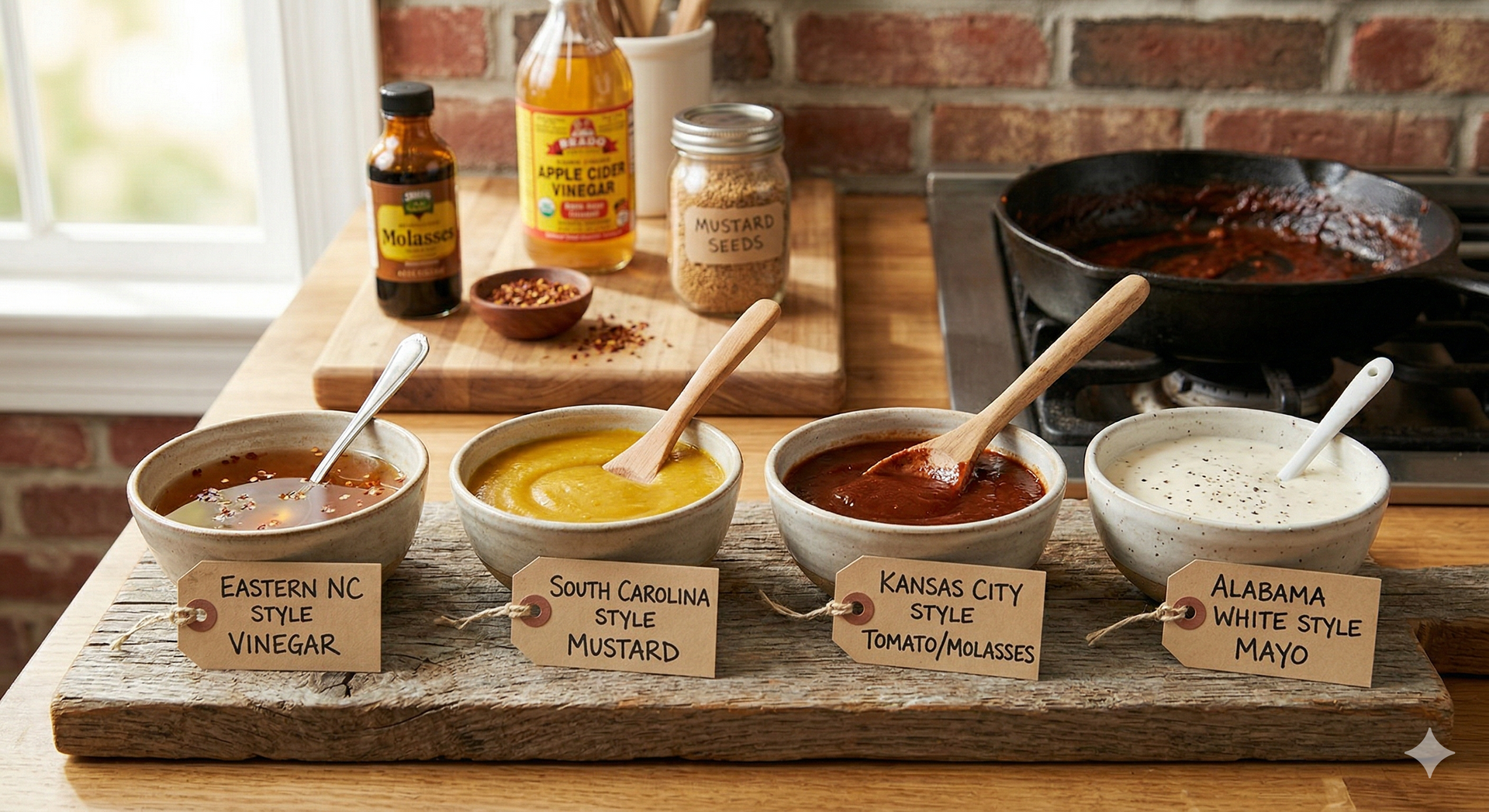 Southern style BBQ sauce is a lot more interesting once you understand why each version exists. It is not just about flavor preference. The vinegar in Eastern Carolina makes sense when you picture whole-hog pork with that much fat. The molasses in Kansas City makes sense when you picture it glazing brisket in an offset smoker.